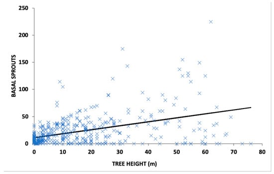Scatter plot of the number of post-fire basal sprouts combined for Sequoia sempervirens (D. Don) Endl.; Notholithocarpus densiflorus (Hook. & Arn.) Manos; Quercus agrifolia Nee.; Myrica californica (Cham. & Schltdl.) Wilbur; and Arbutus menziesii Pursh), in relation to tree height produced in response to a high severity crown fire in Big Basin Redwoods State Park, California.