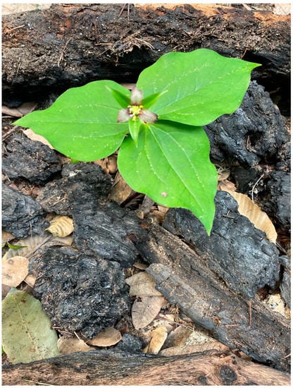 Perennial herb Trillium ovatum Pursh sprouting through charred fuel following a high severity crown fire.