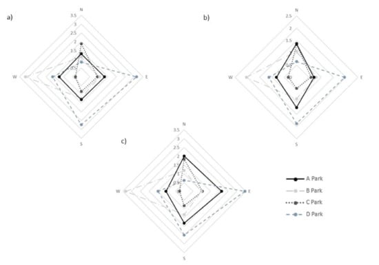 - Landscape shape index (LSI), which was designed by Patton (1975) and describes the compactness of a patch shape [37], in our case compactness of a park shape (7),