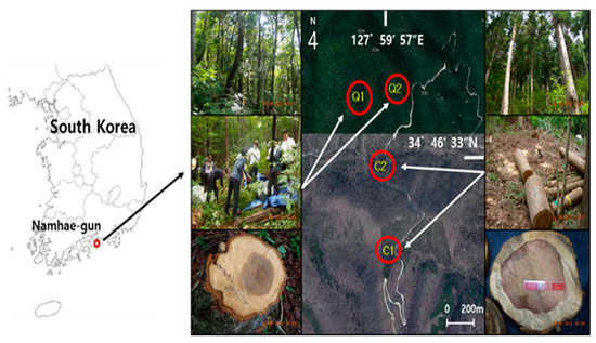 Japanese cedar (Cryptomeria japonica D. Don) which was introduced from Japan in the early 1900s, is an important exotic coniferous tree species that has been used for reforestation in South Korea over the last forty years [5]. Japanese cedar plantations in South Korea are generally established on foot slopes or valley bottoms with good moisture and fertility. The growth in terms of both diameter and height in Japanese cedar between exotic planting tree species was better than that in Japanese cypress (Chamaecyparis obtuse S. et Z.) grown under similar site conditions [12]. Thus, Japanese cedar is a potentially important timber resource in this country. Natural broadleaved Serrata oak (Quercus serrata Murray) is one of the dominant types of oak. The total area and stand volume examined in 2015 were 14,000 ha and 4,850,000 m3 for Japanese cedar and 38,000 ha and 4,783,000 m3 for Serrata oak, respectively [5].