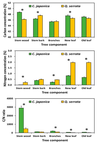 Mean C concentrations in the stem and leaf components (Figure 2) were significantly higher (p < 0.05) in Japanese cedars (stem: 48.7%; leaf: 47.5%) than in Serrata oaks (stem: 46.2%; leaf: 46.6%), whereas the concentration of C in stem bark tended to be higher in Serrata oaks (47.6%) than in Japanese cedars (46.4%). The N concentration in leaves was significantly higher (p < 0.05) in Serrata oaks (1.97%) than in Japanese cedars (0.81%). Consequently, C/N ratio was significantly different between Japanese cedars and Serrata oaks except for stem bark.