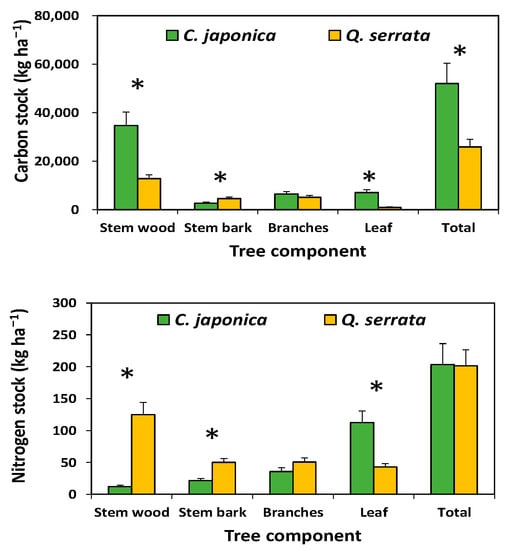 Carbon and nitrogen stocks of tree components in Cryptomeria japonica plantations and Quercus serrata stands. Vertical bar represents standard error. Asterisk (*) indicates a significant difference between stand types at p < 0.05.