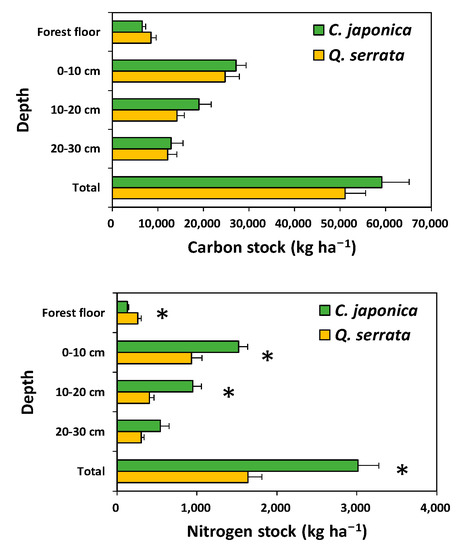 Carbon stocks in the aboveground tree biomass were significantly higher in the Japanese cedar plantation, which had a greater basal area, than in the Serrata oak stand. However, N stocks in stem wood and stem bark were significantly lower in the Japanese cedar plantation than in the Serrata oak stand. In contrast to the woody components, N stocks in the leaves were significantly higher in the Japanese cedar plantation than in the Serrata oak stand (Figure 3). Carbon stocks in the forest floor and the soil were not significantly different (p > 0.05) between the Japanese cedar plantation and the Serrata oak stand; however, N stocks in the soil were significantly higher in the Japanese cedar plantation than in the Serrata oak stand (Figure 4).