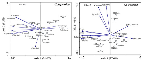 Principle component analysis of soil properties in Cryptomeria japonica plantations and Quercus serrata stands.