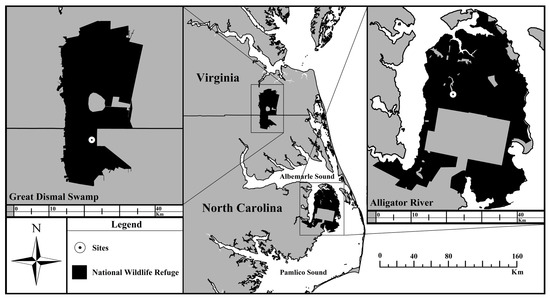 Alligator River National Wildlife Refuge (ARNWR) is located between the Albemarle Sound and Pamlico Sound about 16 km from the Atlantic Ocean on the Albemarle-Pamlico Peninsula (Figure 1). The ~61,600 ha refuge was established in 1984 [59]. ARNWR ranges in elevation above sea level from 3.8 m in the west to 0.3 m in the east [60] and water inputs in this hydrogeomorphic setting are primarily influenced by wind direction and wind tides [6]. The dominant habitat type in the refuge is pocosin wetlands and AWC stands comprise ~2700 ha, which have been considered among the largest continuous stands of AWC in the species’ range [19]. The pocosin wetlands that the refuge contains are characterized by deep mucks and peats, predominantly Pungo Muck soil series [60], which has organic horizons to a depth of 1.83 m [61]. Site selection included AWC as the dominant canopy species and Swamp Tupelo, Nyssa biflora Walt., was commonly associated in the canopy [62]. Sample sites were along Milltail Creek, a water body that flows east to west across the peninsula (Figure 1).