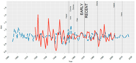 Ring Width Index (RWI) for the full study period, 1895–2018. ARNWR (dashed blue) spans 1895–2018 and GDSNWR (red) spans 1919–2003. Years 1971/1972 denote division of early and recent periods. The five most intense named hurricanes in ARNWR (based on wind speed in the area of interest) and three of regional importance from published studies are labeled. Higher names indicate greater relative intensity.