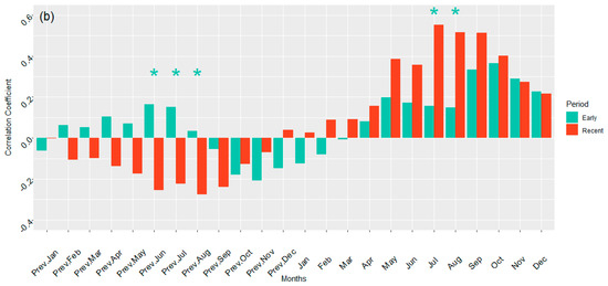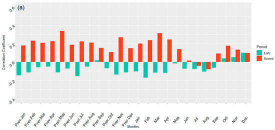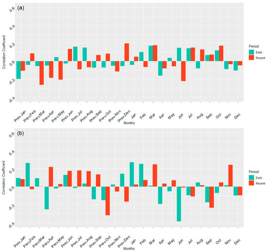 ARNWR average monthly temperature for the early period had the highest correlation value in March (rs = 0.173) and the lowest correlation value in previous January (rs = −0.198) (Figure 4a). Correlation values between the previous and current year lacked a clear trend. The average monthly temperature for the recent period had the highest correlation value in previous December (rs = 0.197) and the lowest correlation value in Previous March (rs= −0.262). Correlation values between previous and current years lacked a clear trend.