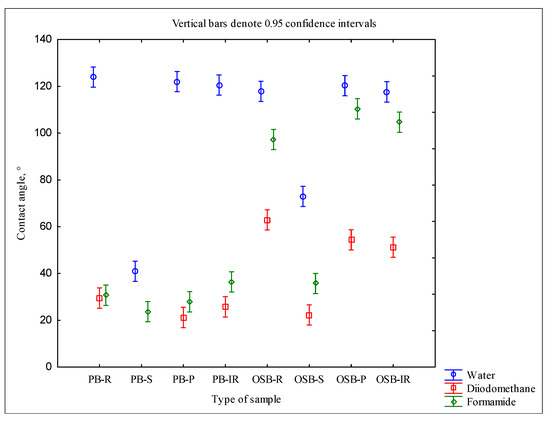 The values of the contact angle of water were quite high on particleboard and OSB, due to a large amount of resin on the panel surface (Figure 1). Therefore, wetting of the particleboard and OSB surface with water improved when the surface layer of resin was removed with sanding. Improving the wetting of the particleboard and OSB surface with water after sanding can have a significant impact on improving the adhesion of water-based coatings. Re-pressing at a temperature of 120 °C and heating at 50 °C had no significant effect on the wetting of particleboard and OSB surfaces with water, formamide, and diiodomethane. According to the literature, temperatures above 150 °C cause an increase in water contact angle on OSB [37].