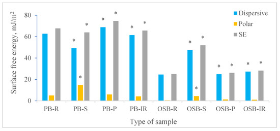 Surface free energy with a dispersive and polar component on particleboard and OSB samples (PB-R: raw particleboard, PB-S: sanded particleboard, PB-P: re-pressed particleboard, PB-IR: heated particleboard, OSB-R: raw OSB, OSB-S: sanded OSB, OSB-P: re-pressed OSB, and OSB-IR: heated OSB). * Difference statistically significant in comparison with raw particleboard or OSB panel according to the Tukey test at α = 0.05 significance level.