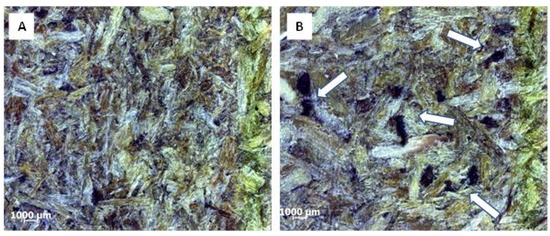 Micrographs of raw (A) and sanded (B) surface of particleboard at 40× magnification.