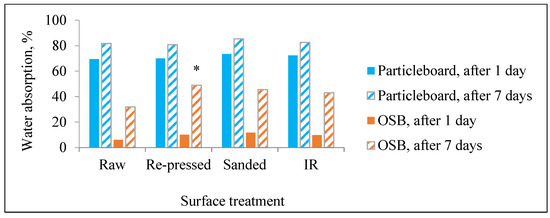 The results of water absorption for particleboard and OSB, depending on the exposure time and surface treatment of the panel, are given in Figure 4. Apart from the fact that the water absorption of each of the examined test samples groups rose with the extension of the time of exposure, additional conclusions could be made. Sanding of particleboard and OSB samples increased water absorption, which is almost certainly the result of permanent removal of protective, hydrophobic (wax) layer from the surface of test samples, accompanied with complete removal of wood dust-resin spots from the particleboard surface (Figure 3B). The pressure of 0.8 MPa is not enough to cause a major increase in density of tested particleboard and OSB (0.3% on average) and consequent reduction in water absorption. Therefore, the increase in water absorption of particleboard and OSB after re-pressing can be also related to the removal of a protective, hydrophobic (wax) layer from the surface caused by a high temperature (120 °C) during re-pressing.