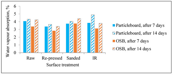 The results also reveal that the differences between the water vapour absorption values obtained after 7 and 14 days, in all the examined cases are less than 1.0%. Those differences could be associated with the small changes of surface hydrophylicity due to the mechanical removal of hydrophobic wax barrier (OSB) and lignin degradation (particleboard) as it is known that, in wood, most sorption sites are found in the hemicelluloses followed by cellulose and lignin [57]. However, sorption processes (water absorption and water vapour absorption), are also controlled through the relaxation of swelling and/or thermal stresses caused by local changes in concentration of bound water and/or temperature [58]. Therefore, further experimental work is needed in order to fully explain the influence of surface pre-treatment on particleboard and OSB sorption processes.
