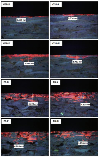 For measuring the depth of water penetration into the tested OSB and particleboard samples the dye with Rhodamine B was prepared (1% water solution of Rhodamine B dissolved in acetic acid). On the surface of tested panel samples, 3 mL of prepared dye was applied and left for 24 h. The dye was covered with a watch glass to prevent evaporation and spillage of the solution over the edges of the sample. After 24 h, the watch glass was removed, and the excess solution of dye was washed with distilled water. The samples, thus prepared, were dried in an oven for 4 h at 80 °C to evaporate any unwashed acetic acid from the surface. After drying, the samples were sawed with a band saw exactly through the middle of the Rhodamine staining trace. The cutting (side) surface was observed with a digital UV microscope with a magnification of 30× and water penetration depth was measured.