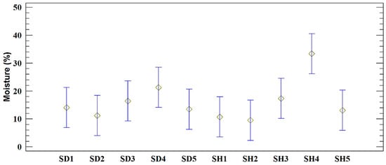 Data reported in the scientific literature indicate an average moisture content of the sawdust ranging from 15% to 37% [63,64]. For the shavings samples, the moisture ranged from 9.54% (±0.78) to 33.55% (±39.26) with an average value of 16.82% (±9.70). These results obtained are within the range of 10% to 60% of the average moisture content reported for biomass [54,65,66], which indicates that an artificial drying process would not be necessary to use it in the elaboration of densified biofuels.