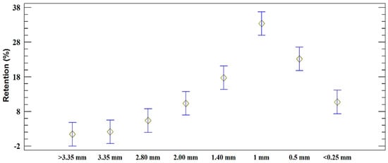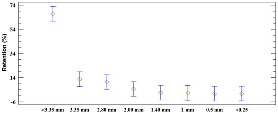 The particle size found in the sawdust samples (SD) can be seen in Figure 2, and Figure 3 shows the particle size found in the shavings samples (SH). These values correspond to the average of the five samples taken for each type of material.