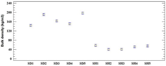Bulk density of the sawdust (SD) and shavings (SH) samples (kg/m3).