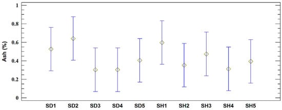 The result of variance analysis indicates that there are no statistically significant differences (p = 0.7820). The ash content in the sawdust samples ranges from 0.30% (±0.33) to 0.64% (±0.39) with an average value of 0.43% (±0.14). The ash content in the shavings samples ranges between 0.31% (±0.36) and 0.59% (±0.36), with an average value of 0.42% (±0.11) (Figure 5).