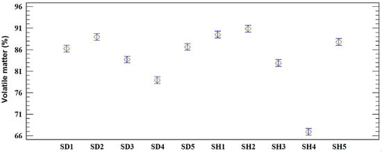 Volatile matter for the sawdust (SD) and shavings (SH) samples (%).