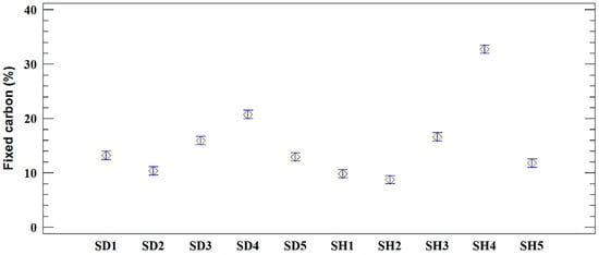 Fixed carbon for the sawdust (SD) and shavings (SH) samples (%).