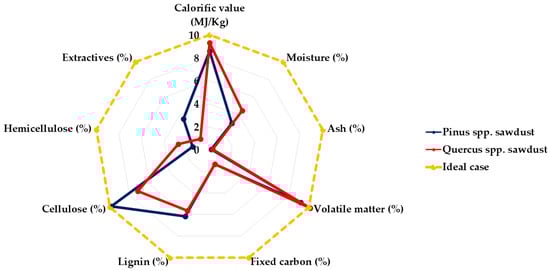 The different indicators that intervened in the respective analysis are shown in Figure 8; this allows comparison of the potential of the Pinus spp. timber residue with that of the Quercus spp. timber residue. In a graphic way, strengths and weaknesses can be appreciated in different aspects, from an energetic, physical-proximal, and chemical composition approach.