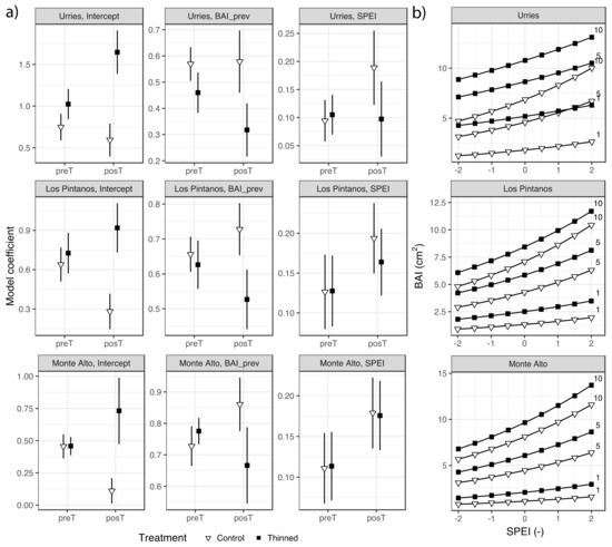 The results confirmed the importance of accounting for the effects of both temporal autocorrelation of BAI and climate. The model intercepts, which indicate the mean BAI under average BAIprev and SPEI, showed non-significant differences between thinning and control plots in the preT period. However, differences arose in the posT period. Thus, while mean BAI tended to decrease in the control plots (significantly so in the Los Pintanos and Monte Alto sites), it experienced a relevant increase in the thinned plots (significantly so in Urriés). After thinning, the mean BAI increase was around 1–1.6 cm2 in Urriés, 0.75–1 cm2 in Los Pintanos, and 0.45–0.80 cm2 in Monte Alto.