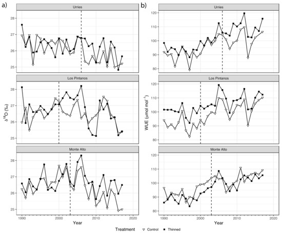 Time series of δ18O (a) and the intrinsic water-use efficiency (WUEi, (b)) in Urriés, Los Pintanos, and Monte Alto study sites: control (white triangles) and thinning (black squares). The dashed vertical lines represent thinning treatments (2006, 2000, and 2003 in Urriés, Los Pintanos, and Monte Alto).