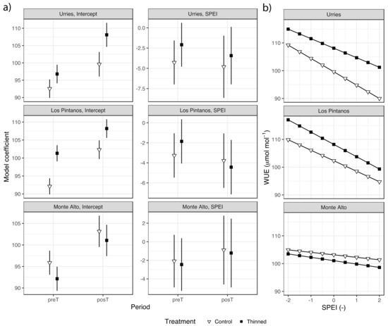 The relation between WUEi and SPEI for the posT period in control and thinned plots is depicted in Figure 5b. The highest WUEi occurred in the thinned plots, except in Monte Alto. In Urriés and Los Pintanos, WUEi ranged roughly between 115 and 90 µmol mol−1 for dry and wet conditions, respectively, while in Monte Alto the range of WUEi variation was narrower.