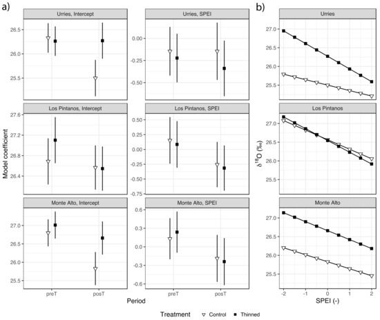 δ18O mean model coefficients for the values of the fixed effects (Bars depict 95% confidence intervals) in Urriés, Los Pintanos and Monte Alto study sites, for the two treatments and pre- (preT) and post-thinning (postT) periods (a), and generalised linear models of δ18O versus SPEI for both treatments only in the posT period (b).