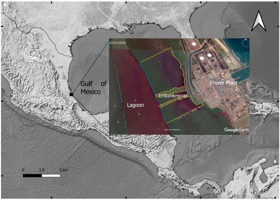 Map showing the location of the study at the northeast coast of the Gulf of Mexico. The mangrove is located between a powerplant to the east and the Tampamachoco lagoon to the west. The study area is marked in yellow and shows different levels of perturbation from the lagoon to the power plant: Apparently unaffected forest (AUF); Partial mangrove mortality (PMM); complete mangrove mortality (CMM); and a thin band of isolated apparently unaffected forest growing next to the power plant (AUF isolated). The embankments that support electric towers can be seen within the study area. Map made in QGIS 3.2 with Natural Earth, free vector and raster map data @ naturalearthdata.com (accessed on 24 July 2021). Satellite image from the study site in 2019 taken from Google Earth Pro.