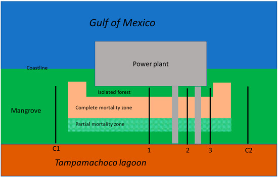 Mangrove forests are diverse ecosystems that provide human communities with many goods and services [1]. Unfortunately, recent climate change is altering the latitudinal limits of woody assemblages [2], and sea-level rise will likely provoke catastrophic changes in most wetlands due to inundation and salinity changes [3,4]. At a more regional and local level, coastal development causes land-cover changes due to different human activities [5,6,7]. Mangroves along the Gulf of Mexico have declined due to urban and harbor development, energy generation, and tourism development [8,9]. Understanding the main drivers of decline and recovery at small spatial scales can help decide on the best management practices to protect and rescue these highly valuable ecosystems [10]. In the coastal area of the southwestern Gulf of Mexico, along with three Mexican states (Tamaulipas, Veracruz, and Tabasco), a fringe of approximately 87,047 ha of mangrove forests is present [11]. Four mangrove species that vary in relative abundance dominate the structure of these forests: Rhizophora mangle L., Avicennia germinans (L.) L., Laguncularia racemosa (L.) Gaertn., and Conocarpus erectus L. [12]. It has been shown that well-preserved mangrove communities are composed, with local variations, of these mangrove species and that the enrichment of the floristic assemblages can, in fact, be a sign of perturbation [13]. In Veracruz, the mangrove fringe is not continuous and is divided into smaller patches (<1000 ha) located between the coast and large coastal lagoons such as Tamiahua, Tampamachoco, and San Agustín [12]. Along the Tampamachoco lagoon, Ramsar site number 1602 was established by Mexico in 2006 due to its vast and well-preserved mangrove area, one of the largest in the Gulf of Mexico. Its structure, composition, productivity, phenology, restoration, and uses have been studied by various local universities—particularly an area of approximatively 40 ha, located near the power plant [14,15,16,17,18]. In the 1980s, the construction of three embankments, built to support power towers, changed the average water circulation, and 20 ha of mangrove developed signs of top dying [17]. This mortality continued until an area between the power plant and the Tampamachoco lagoon ultimately died. Although the activities to set up the power plant were probably the origin of the mortality, there is still no explanation of why the area has not recovered, why restoration efforts have failed, and mortality continues to expand. Within the affected area, five perturbation levels exist: complete mangrove mortality, partial mangrove mortality, apparently unaffected and isolated patches, and adjacent unaffected areas. The present study quantified mangrove community structure in these areas, highlighting structural differences according to perturbation levels. In addition, we used a matrix-population analysis of A. germinans, to assess the effects of transition probabilities and recruitment on the stability of the mangrove forest at the different perturbation areas.