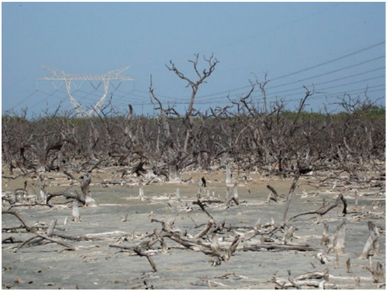 Of the three species located in the study area, A. germinans is the most tolerant to hypersaline conditions and was the most abundant species in the partial mangrove mortality zone [42,43,44]. The construction of the power plant and embankments to support the power lines may have caused changes in hydrological circulation due to the embankment’s location, and this could lead to changes in salinity that may be responsible for the observed mortality [17]. However, despite several restoration efforts, which include opening channels across the embankments, the mangrove has not recovered and continues to deteriorate (Basañez-Muñoz, personal observation).