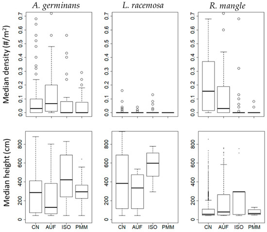 Boxplots showing density and tree height (not including size class I) of Avicennia germinans (L.) L., Laguncularia racemosa (L.) Gaertn. and Rhizophora mangle L. at different perturbation levels (CN = Control, AUF = Apparently unaffected forest, ISO = Isolates apparently unaffected forest, and PMM = Partial mortality mangrove).