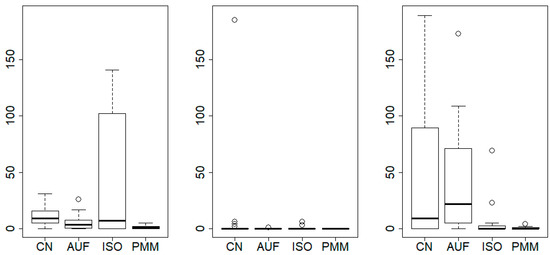Boxplots showing density of seedlings (size class I) of Avicennia germinans (L.) L., Laguncularia racemosa (L.) Gaertn. and Rhizophora mangle L. at different perturbation levels (CN = Control, AUF = Apparently unaffected forest, ISO = Isolates apparently unaffected forest, and PMM = Partial mortality mangrove).