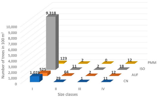 Size structures of A. germinans by perturbation zone (Control CN; Apparently unaffected forest AUF; Isolated apparently unaffected forest ISO; and partial mangrove mortality PMM). Size classes: I, <40 cm in height (seedlings); II, from 40 to <150 cm in height (juveniles); III, >150 cm in height but with <2.5 cm in diameter at breast height (DBH) (young tree); and IV, >150 cm in height and DBH between 2.5 to >10 cm (adult trees).