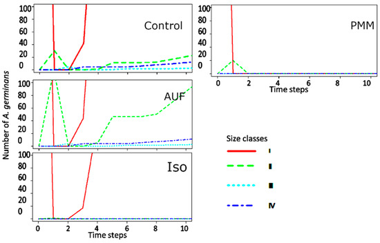 Projections based on A. germinans at different perturbation levels: Control, apparently unaffected forest (AUF); isolated AUF (ISO) and Partial mangrove mortality (PMM). Size classes: I, <40 cm in height (seedlings); II, from 40 to <150 cm in height (juveniles); III, >150 cm in height but with <2.5 cm in diameter at breast height (DBH) (young tree); and IV, >150 cm in height and DBH between 2.5 to >10 cm (adult trees). Note that the y-axis scale was limited to 100 trees to be able to appreciate the dynamic of size classes II to IV, but the projections started with 1000 seedlings in size class I as demonstrated by the red line that rapidly drops from time step 0 to 1, as seedling mortality is large at all the observed areas; in control, AUF and ISO, the number of seedlings recovers and at time steps 3–4, increases to >100 units.