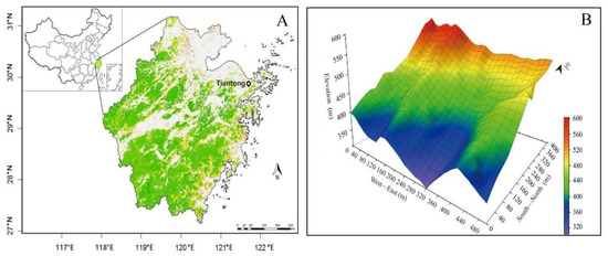 The study area location in Zhejiang Province, China (A) and the perspective map of topography of the 20-ha Tiantong forest dynamics plot (B).