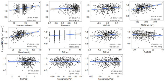 Bivariate relationships between forest productivity (ln-transformed ΔAGB) and species diversity [(a) species richness, (b) evenness], species composition [(c) NMDS1], initial above-ground biomass [(d) AGBi], structural factors [(e) stand density, (f) DBH classes (DBHcs), and (g) tree size diversity (DBHsi)], environmental factors [(h) soil PC1, (i) soil PC2, (j) topography PC1, and (k) topography PC2] in Tiantong plot (CI, 95% confidence interval for the regression coefficients).