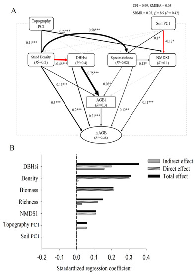 The structural equation model of species diversity, species composition, structural diversity, above-ground biomass, and environmental factors and ΔAGB, as well as the effects of standardization (A); black and red solid lines represent positive and negative effects, respectively. Widths of solid lines indicate path strengths; dotted lines indicate non-significant correlations. Numbers and associated asterisks are standardized path coefficients and significance levels (* p < 0.05; ** p < 0.01; *** p < 0.001) for each path. (B) Standardized effects of each factor; black hatched bars show the direct effects, gray bars show indirect effects, and black bars show total effects.
