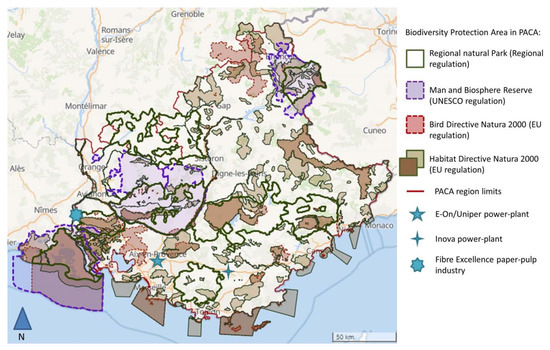 Map of PACA environmental regulations decided at upper scales (global scale: man and biosphere reserve labelled by UNESCO; European scale: Natura 2000 area; National and regional scales: Regional Natural Parks) and location of the three main industrial actors (E-On/Uniper, Inova and Fibre Excellence). Map edited from the online Regional Natural Park database for geographical information system (SIT PACA Database).
