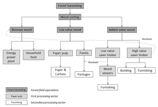 It was only in the 1950s that a big company, named Fibre Excellence, settled in the PACA region to produce paper pulp (Figure 1). Fibre Excellence is still in operation. Indeed, this company generated a boom in the forestry sector that coincided with the large-scale abandonment of agricultural land and forest area expansion. However, economic profits in the forestry sector continued and remain underdeveloped because of the lack of diversity in wood processes and markets (Figure 2). The current lack of management plans and secondary processing sectors keep the wood price per ton in the PACA region at a very low level, forcing forest owners and foresters to produce wood in terms of quantity, rather than quality (“Here, and in France in general, we know how to produce wood, but we don’t have wood processing industries. This does not encourage to develop management plans for future” (Forest community association member, personal interview, May 2017)).