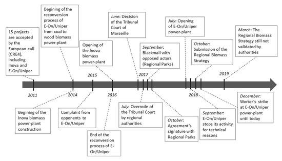 Due to this preliminary reluctance and the weak network organisation of forest actors, the delays observed in operational planning gave decision-making power to big industries and created insecurity for small local forest companies. To respond to the industrial demands for wood resources, the PACA region had to create a committee, named the Regional Biomass Committee, in charge of implementing a supply strategy. The committee is constituted from regional institution members, a private forest owner union, a local forester company union, the forest cooperative, and all wood industrial actors, including E-On/Uniper, Inova, and Fibre Excellence. However, the committee was established after the national decision allowing E-On/Uniper and Inova to set up in the region, and the final strategy report, named Regional Biomass Strategy (RBS), was published only in October 2018, whereas the development of the wood biomass sector for electric energy purposes began in PACA in 2014 (see the chronology in Figure 3). In the short-term, the delay in the RBS has created economic insecurity for forest operators and reluctance from private owners. In the long-term, it could threaten forestry sector development in PACA, the local biodiversity, and the carbon storage potential, so by extension the sustainability of PACA’s forests. Such a lack of reliable information illustrates that the key condition No 1 is not fulfilled (Box 1).