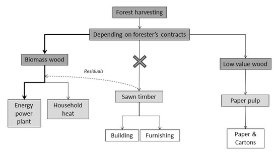 In France, reaching the H2020 goal requires that renewable energy sources must more than double their 2005 share (10.3%) in terms of gross final consumption of energy to reach a final goal of 23% at the national scale (each member state has a different goal, which allows a 20% share to be achieved at the European scale). In 2006, the wood biomass energy in France represented 83% of the thermal renewable energy consumed by households and industries (i.e., 9 million tons of oil equivalent (toe) of wood biomass per year). This represents 50% of the French renewable energy production [13,14]. Moreover, wood biomass energy is considered as an interesting strategy for France, taking account that the standing volume of wood in France has been increasing by 0.7% per year since 1992 [15]. Even if an increase of the wood standing volume does not necessarily increase its availability, in 2016, the French Forest Ministry edited a national report to promote forestry sectors with a strategy to develop wood biomass energy at large scale [16].