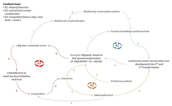 This situation has strongly degraded the trust that had prevailed for more than half a century between foresters and industrial sectors (mainly with Fibre Excellence). This explains why the key condition No 3 is not encountered (Box 1). Based on the knowledge we gathered through interviews, participative workshops, observant participation, and archive analysis, we designed an integrative causal-loop diagram describing local dynamics of the PACA forest system (Figure 5). The three feedback loops maintain the system in a deadlock process combining the historical barriers (R1 in blue in Figure 5), the top-down implementation of the wood biomass policy (R2 in orange in Figure 5), and the consequences of the created unfair competition (R3 in red in Figure 5).