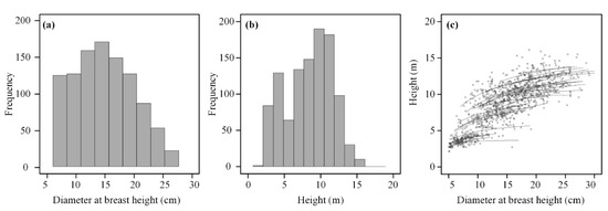 Only the trees with D ≥ 5 cm were used in this analysis. A total of 1070 paired height-diameter measurements were chosen for the model development. This dataset was used for the parameter estimation and model calibration. The distributions of the height and diameter at breast measurements are illustrated in Figure 1.