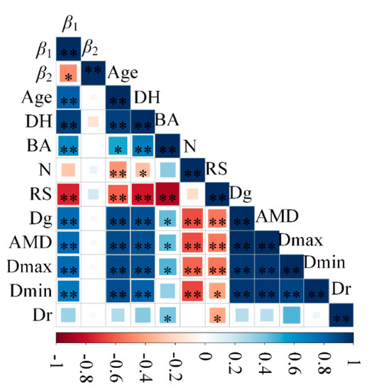 Figure 2. Correlation among the stand-level predictor variables and basic height-diameter (H-D) model coefficients. Age is the stand age; DH is the dominant height; BA is the basal area per hectare; N is the stand density; RS is the relative spacing; Dg is the stand quadratic mean diameter; AMD is the stand arithmetic mean diameter; Dmax and Dmin are the maximum and minimum diameter of the plot, respectively; Dr is diameter range per plot; β1 and β2 are model parameters. * and ** denote the significant correlation at level of p < 0.05 and p < 0.01, respectively.