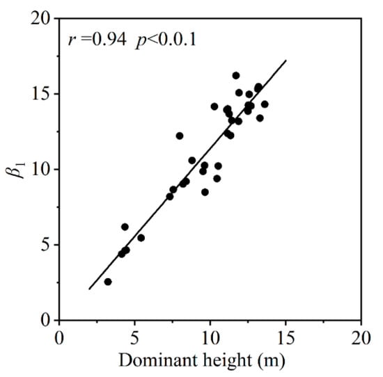 Figure 3. Linear relationship between the dominant height (DH) and the estimated coefficient β1 of the basic model. R means the Pearson correlation between the model coefficient β1 of the basic model and dominant height.