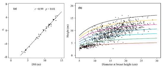 Figure 5. The Pearson correlation between DH and the estimated random-effects of the basic mixed-effects model (a), and effects of DH on H-D relationships (b). The fitted H-D curves in the figure (b) were based on the fixed prediction of the generalized mixed-effects model. The colorful lines from the bottom to the top indicate DH values from 4 m (red) to 16 m (black) with a step of 2 m. The scatters in (b) are the H-D measurements.
