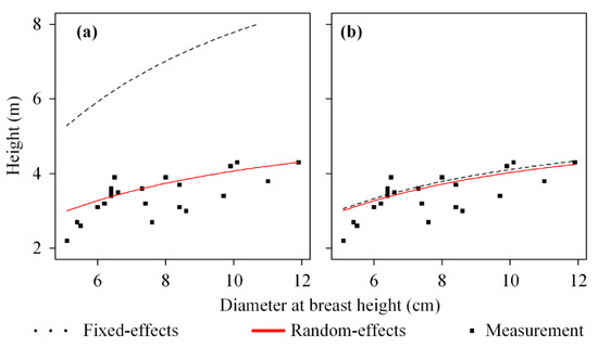 Figure 7. Fixed- and random-effects prediction performance for the basic (a) and generalized (b) mixed-effects models in an example plot. (a) The curve of random-effects prediction of basic mixed-effects model was based on calibration with the two thickest trees. (b) The curve of random-effects prediction was based on calibration with one medium-sized tree.