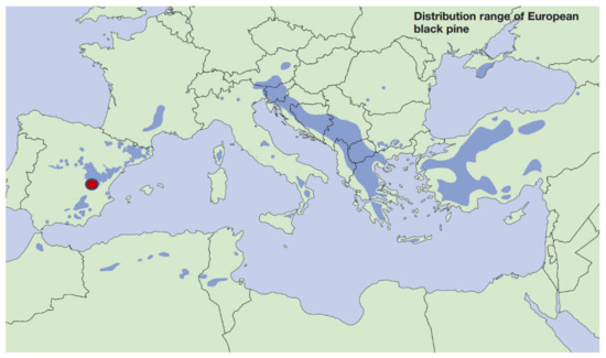 Location of the Pinus nigra Arn. salzmannii sites (red ellipse). The map shows the distribution of Pinus nigra Arn. across the Mediterranean Basin according to Euforgen (http://www.euforgen.org/species/pinus-nigra/, accessed on 26 May 2021).