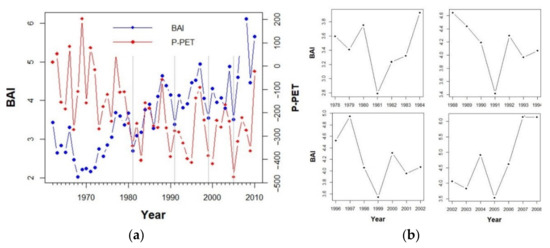 (a) Mean annual Basal Area Increment (BAI, cm) and annual water balance (P-PET, mm) for the studied period (1962–2010). Vertical grey lines depict studied drought events. (b) The right panel shows detailed mean BAI values for each drought event and the three years preceding and following the event.